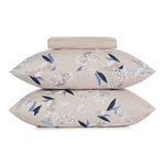 A estampa Kyoto combina a suavidade do bege mocha com flores e folhagens em tons de azul e cinza, criando um visual sofisticado e acolhedor para o quarto. Confeccionada em puro algodão de alta maciez, a coleção oferece edredom com enchimento em poliéster thermobonder leve, colchas com viés e porta-travesseiros no tamanho padrão com abas e acabamento em matelassado quadriculado, que mantém o enchimento bem distribuído e confere um relevo elegante. O jogo de cama completo traz lençol superior com dobra feita, lençol inferior com elástico que se adapta a colchões queen e king de até quarenta centímetros de altura e fronhas estilo envelope com viés e acabamento em rolotê. Já o jogo de cama simples é ideal para o dia a dia, com lençol de elástico e fronhas envelope sem abas. Uma coleção versátil que une conforto, praticidade e beleza em cada detalhe, perfeita para transformar sua cama em um refúgio acolhedor.